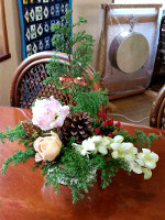クリスマスフラワーアレンジメントのレッスンの様子と、先生の完成した作品です。